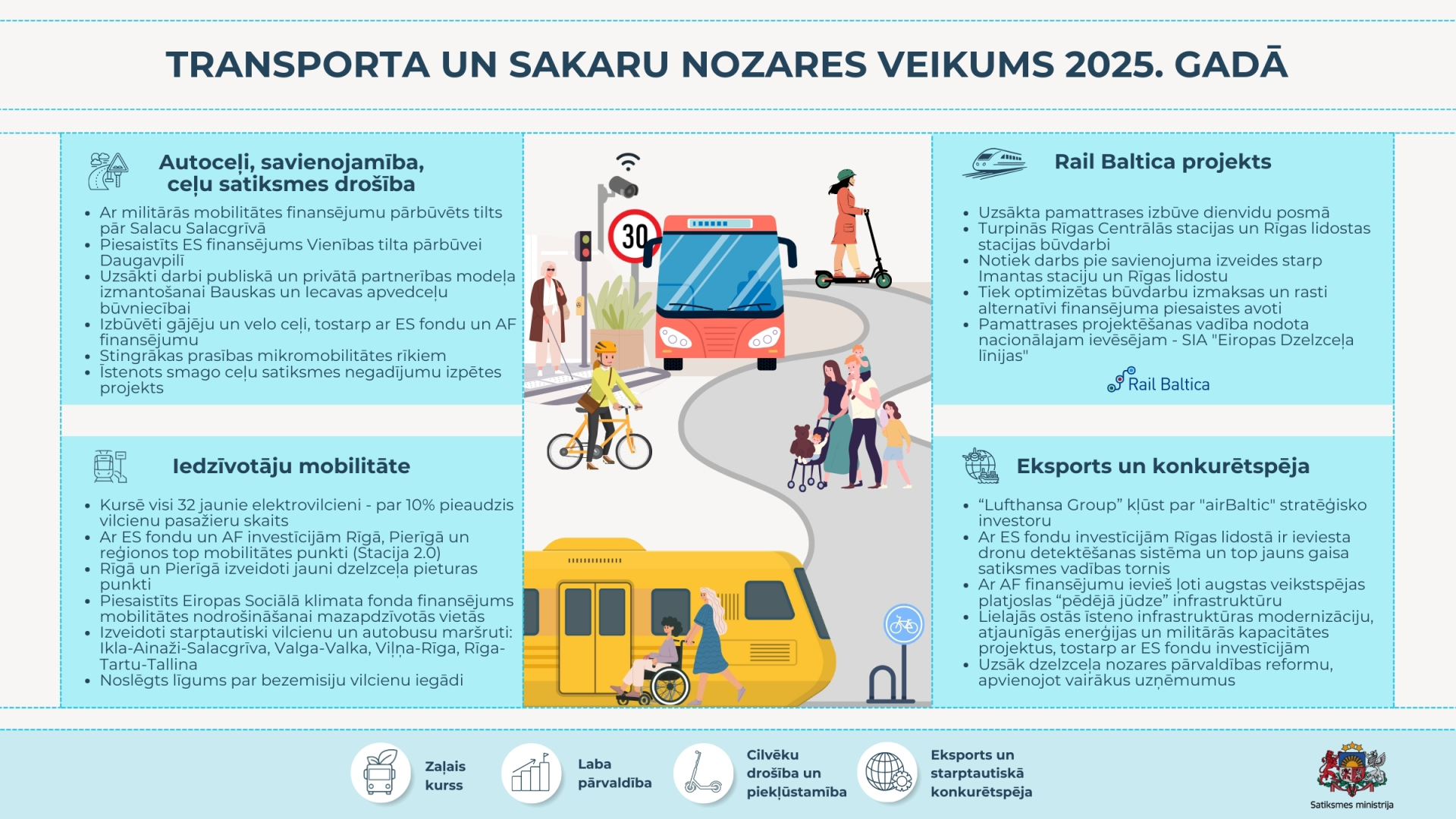 Uzsākts darbs, lai ar Eiropas Sociālā klimata fonda atbalstu tiku ieviests transports pēc pieprasījuma mazapdzīvotās vietās. Savukārt pārrobežu savienojamības stiprināšanai sadarbībā ar Lietuvas un Igaunijas pārvadātājiem ir izveidoti starptautiski vilcienu maršruti starp Baltijas valstu galvaspilsētām, t.sk. veikti visi priekšdarbi, lai 2026.gada 12. janvārī varētu uzsākt jaunu vilcienu satiksmi maršrutā Tallina-Tartu-Rīga. Atklāti jauni eksperimentālie autobusu maršruti Igaunijas un Latvijas pierobežā. Stiprinot dzelzceļu kā sabiedriskā transporta mugurkaulu, Rīgā un Pierīgā atklāti jauni dzelzceļa pieturas punkti, un gada nogalē, rodot iespēju piesaistīt ES fondu finansējumu, noslēgts līgums par bezemisiju (BEMU) vilcienu piegādi, kas ļaus nomainīt daļu no novecojušā dīzeļvilcienu parka, vienlaicīgi veicinot klimata mērķu sasniegšanu.