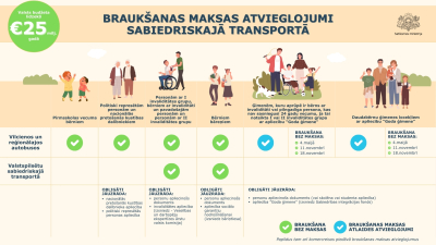Arī šogad likumdošanā noteiktām iedzīvotāju grupām, tostarp pirmsskolas vecuma bērniem, bērniem bāreņiem, politiski represētām personām, bērniem ar invaliditāti, personām, kurām noteikta I invaliditātes grupa un to pavadošajām personām, kā arī personām, kurām noteikta II invaliditātes grupa un daudzbērnu ģimenēm sabiedriskajā transportā tiks nodrošināti braukšanas maksas atvieglojumi. Satiksmes ministrijas (SM) 2026. gada budžetā šim mērķim finansējums nav samazināts, tas ir palicis tāds pats kā iepriekšējos gadus – 25 milj.eiro. Braukšanas maksas atvieglojumu saņemšanai obligāti ir jāuzrāda likumdošanā noteiktie personu apliecinošie dokumenti.