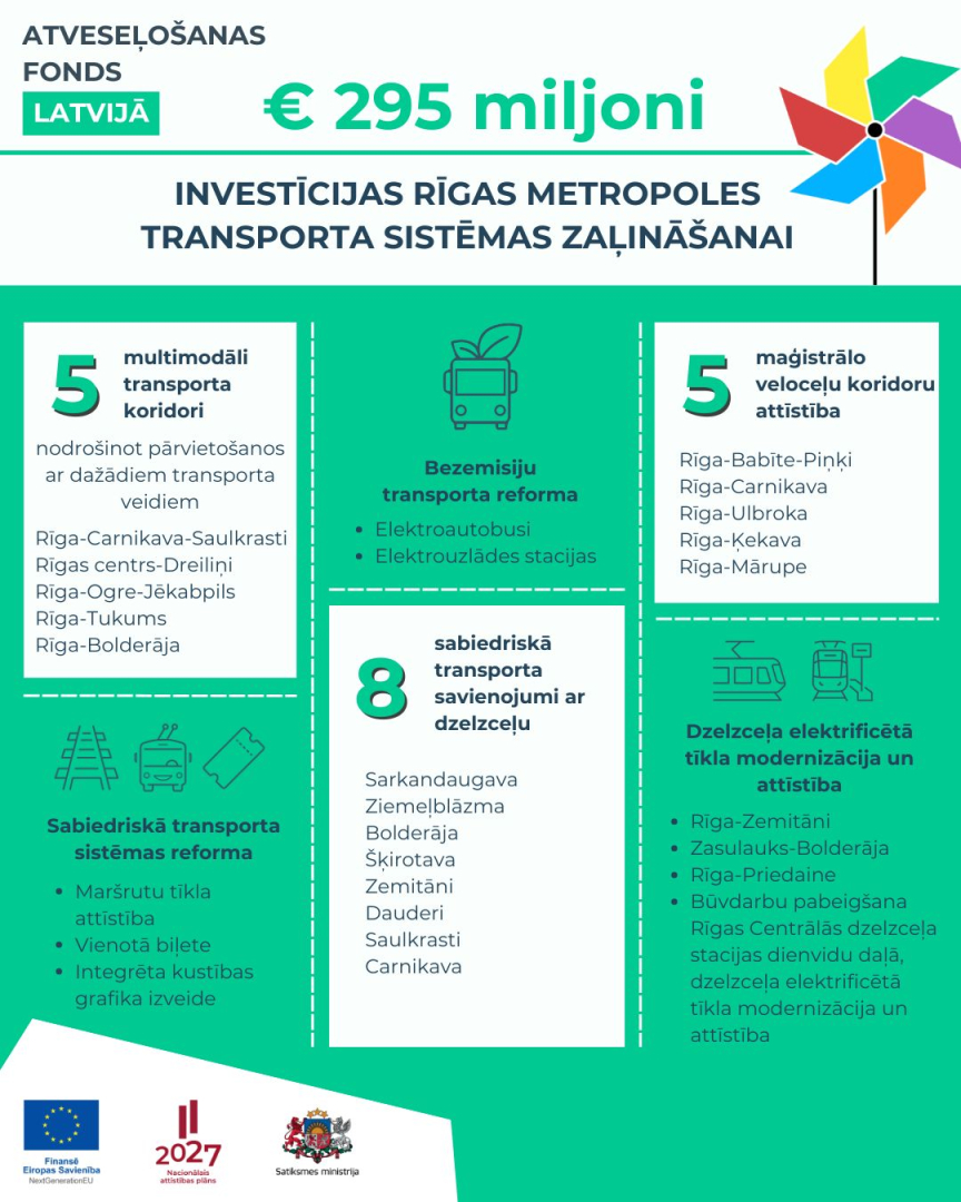 Satiksmes ministrijas (SM) pārraudzībā Atveseļošanas fonda (AF) ietvaros tiek īstenota Rīgas un Pierīgas sabiedriskā transporta sistēmas zaļināšanas reforma, kuras mērķis ir mazināt transporta radīto negatīvo ietekmi uz galvaspilsētas vides kvalitāti un veidot iedzīvotāju vajadzībām atbilstošus integrētus sabiedriskā transporta pakalpojumus. AF finansējums 295 miljoni eiro apmērā tiks ieguldīts Rīgas un Pierīgas sabiedriskā transporta sistēmas modernizācijai un zaļināšanai. Par reformas portfelī iekļaujamiem pasākumiem un projektiem vienojusies darba grupa, kurā strādāja SM, Rīgas un Rīgas plānošanas reģiona pārstāvji un transporta nozares speciālisti.