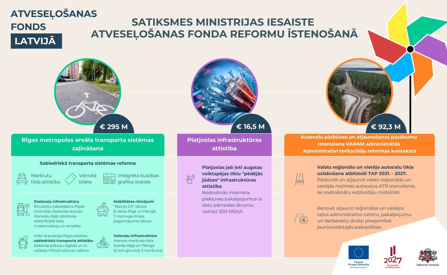 Satiksmes ministrijas (SM) pārraudzībā AF ietvaros īsteno Rīgas un Pierīgas sabiedriskā transporta sistēmas reformu, kuras mērķis ir mazināt transporta radīto negatīvo ietekmi uz galvaspilsētas vides kvalitāti un veidot iedzīvotāju vajadzībām atbilstošus integrētus sabiedriskā transporta pakalpojumus. AF finansējums reformas īstenošanai ir 295 miljoni eiro. Tāpat SM elektronisko sakaru nozarē īsteno reformu “Platjoslas infrastruktūras attīstība”, kuras mērķis ir veicināt pāreju uz ļoti augstas veiktspējas elektronisko sakaru tīkliem, kas iedzīvotājiem nodrošinās piekļuvi ātram internetam visā valsts teritorijā. AF finansējums reformas īstenošanai ir 16,6 miljoni eiro.