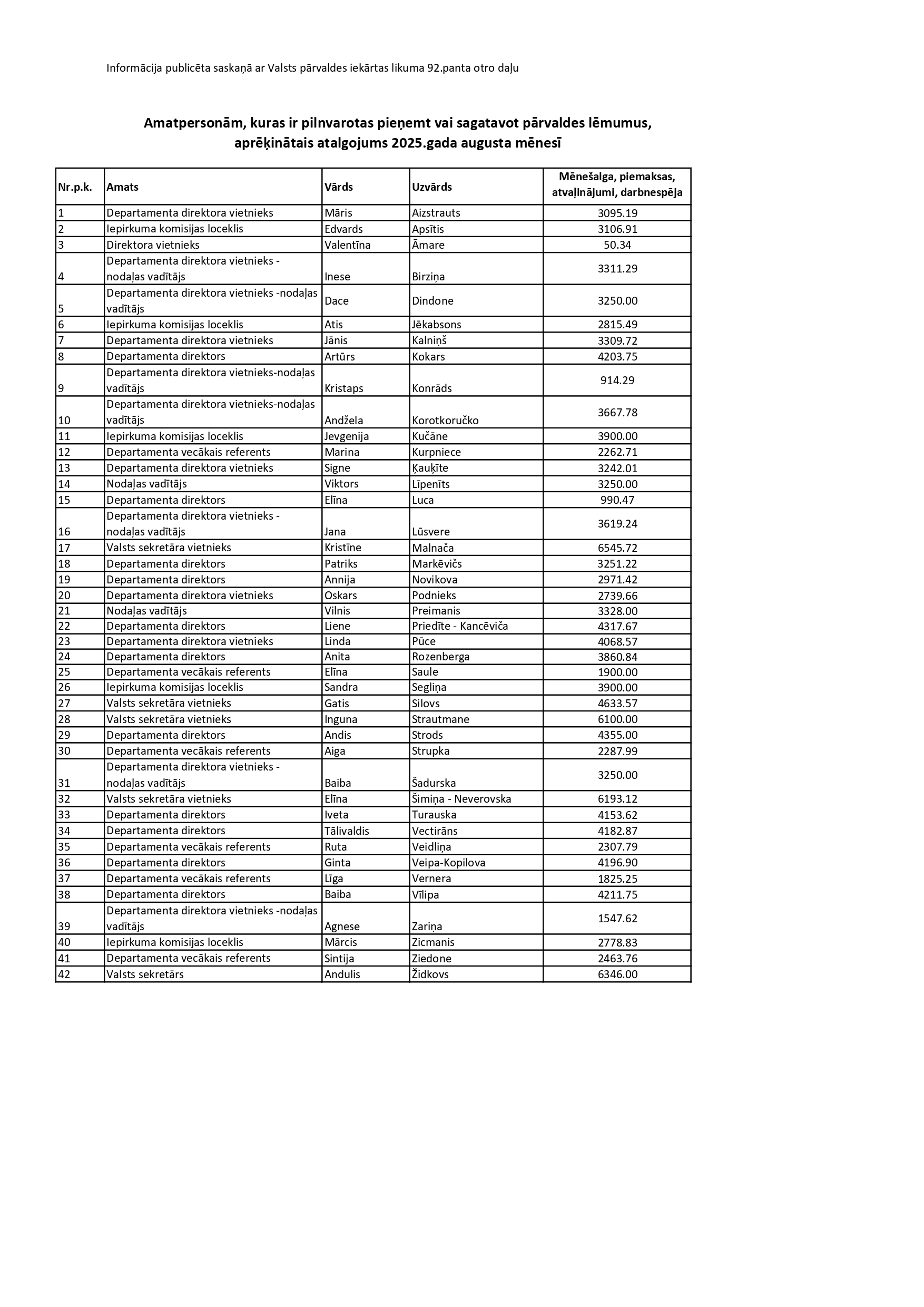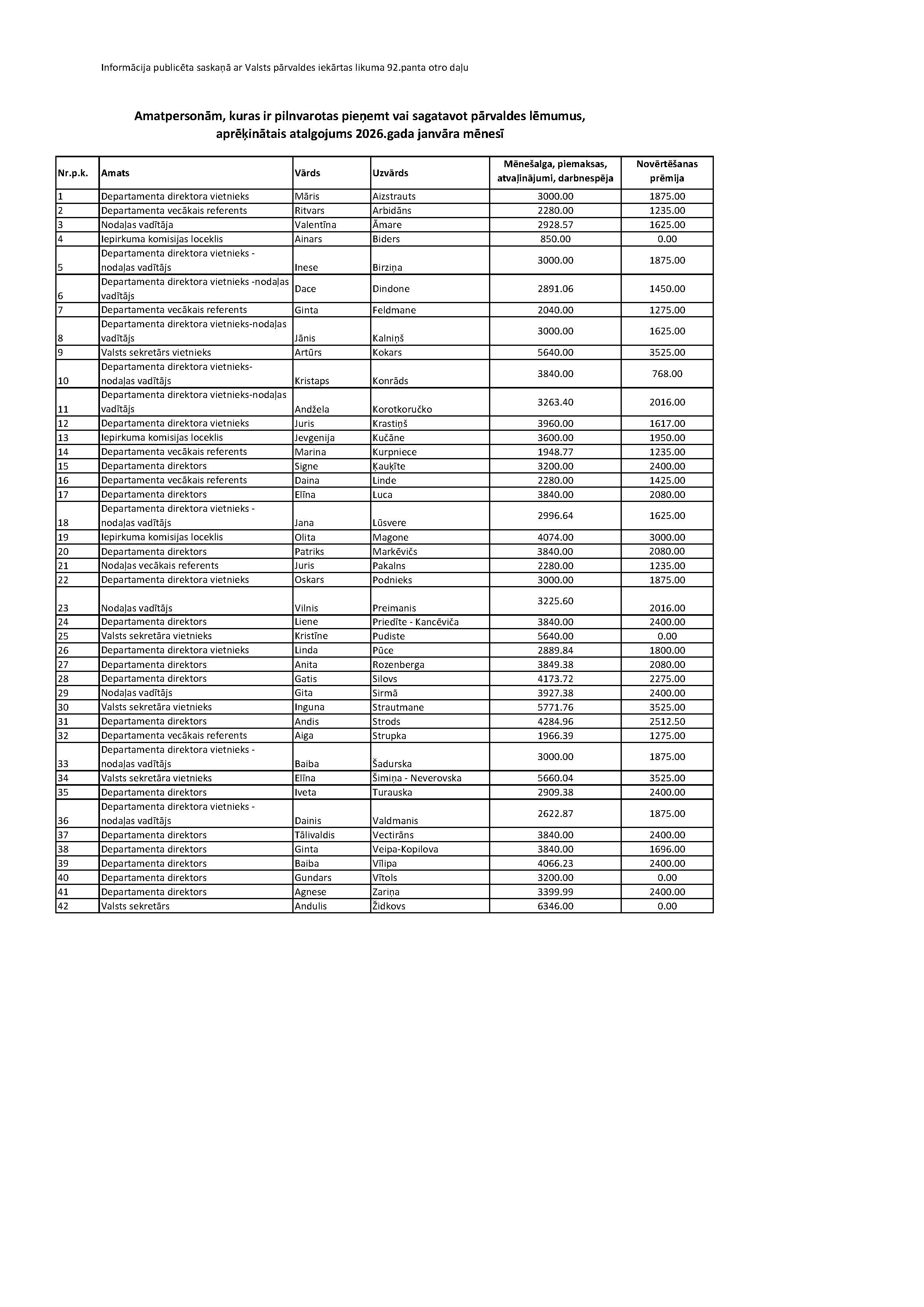 - Informācija publicēta saskaņā ar Ministru kabineta 2016. gada 12. aprīļa noteikumiem Nr. 225 "Kārtība, kādā tiek publiskota informācija par amatpersonu (darbinieku) atlīdzības noteikšanas kritērijiem un darba samaksas apmēru sadalījumā pa amatu grupām"