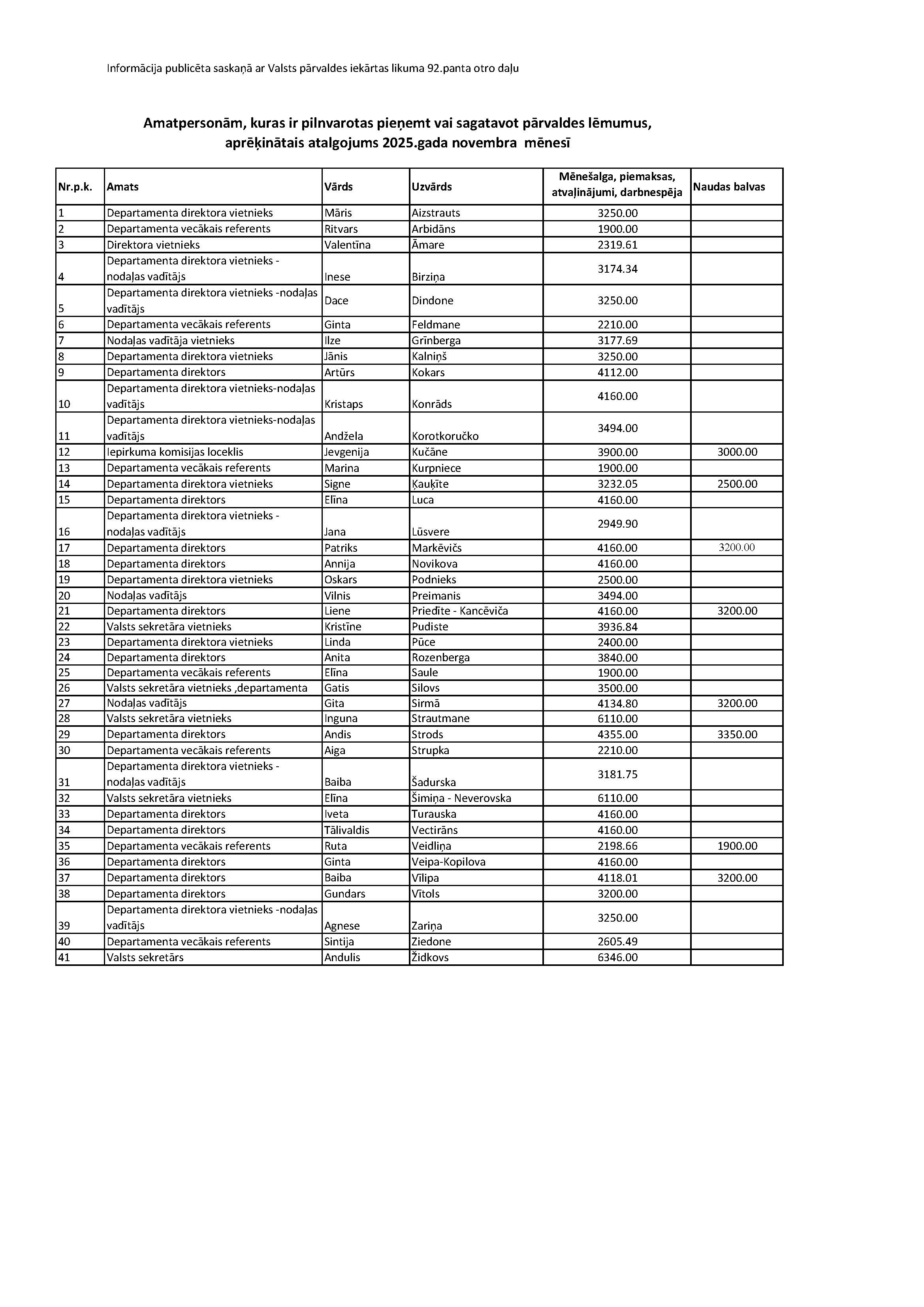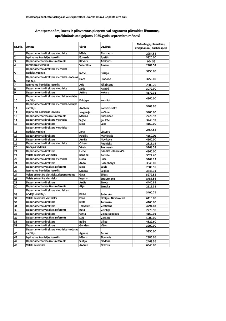 Amatpersonām, kuras vispārīgi vai konkrētā gadījumā ir pilnvarota pieņemt pārvaldes lēmumu vai pilnvarota pieņemt vai piedalās administratīvā akta pieņemšanā, aprēķinātais atalgojums 2025.gada septembrī: