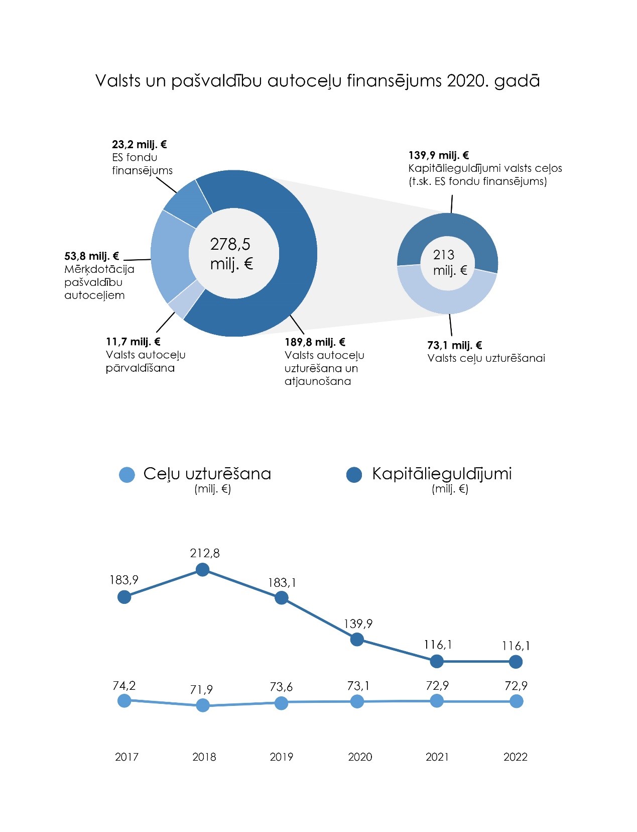 Nākamajā gadā plānots pabeigt būvdarbus uz Jūrmalas un Siguldas šosejām. 2020. gadā būvdarbi paredzēti uz 239 km valsts galveno un reģionālo autoceļu un 152 km valsts vietējo autoceļu tīklā. Pārbūves darbi jeb jaunu ceļu būvniecība plānota tikai 70 km valsts galveno un reģionālo autoceļu tīklā, pārējie ir darbi, kas saistīti ar virskārtas atjaunošanu. Kopā Latvijā ir 7126 km valsts galvenie un reģionālie autoceļi, tātad pārbūvei pieejamais finansējums ir mazāks par 1 % no kopējā autoceļu tīkla.