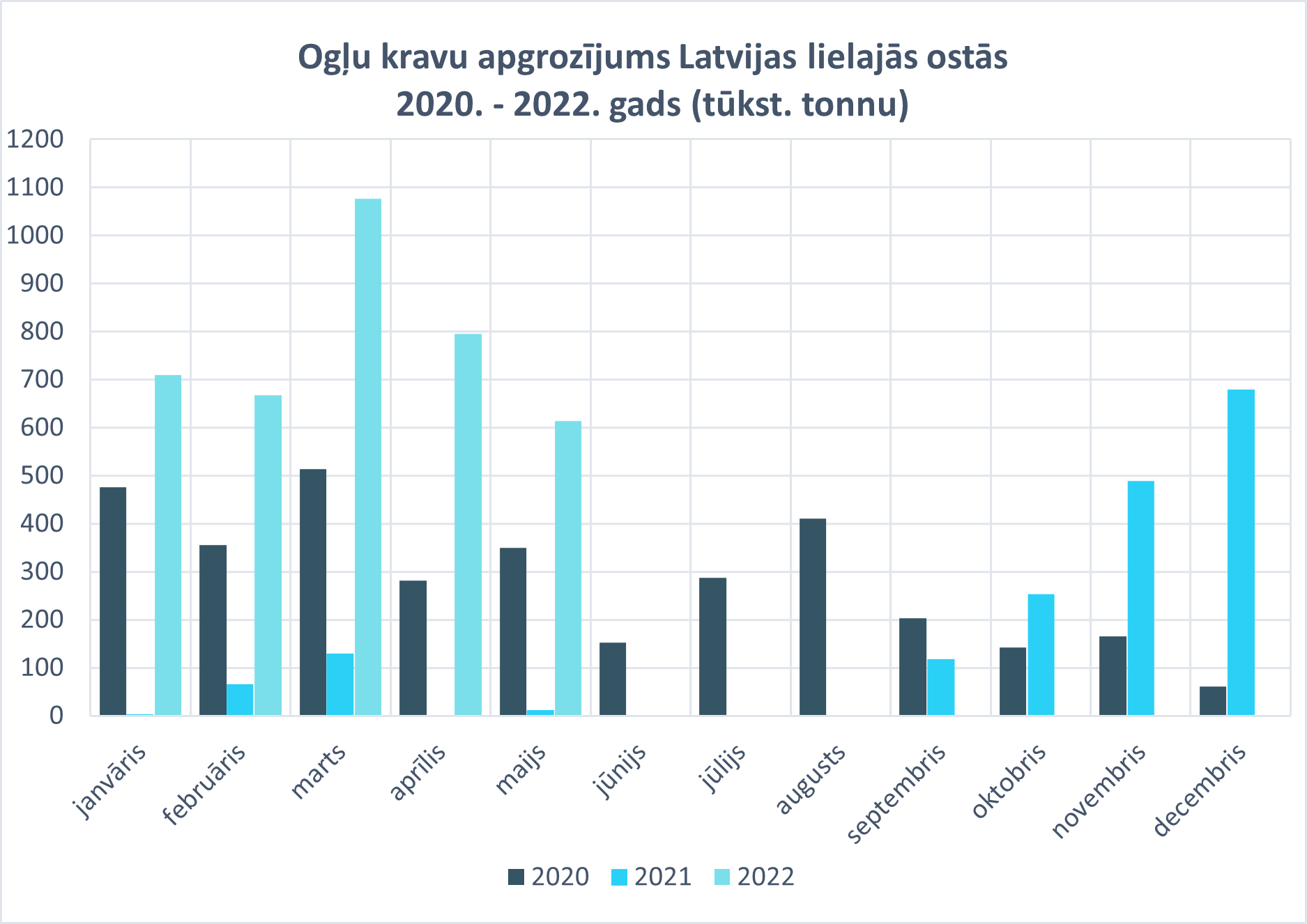 Gada pirmajos piecos mēnešos lielajās ostās pārkrauti 3,86 miljoni tonnu akmeņogļu, kas ir pieaugums par 17,9 reizēm, salīdzinot ar pagājušā gada šādu pašu periodu. Taču maijā pārkrautie 614 tūkstoši tonnu akmeņogļu ir samazinājums par 23% attiecībā pret aprīli. Visvairāk akmeņogļu maijā pārkrauts Rīgas ostā – 423,4 tūkstoši tonnu, kam seko Ventspils osta ar 190,6 tūkstošiem tonnu pārkrautu ogļu.